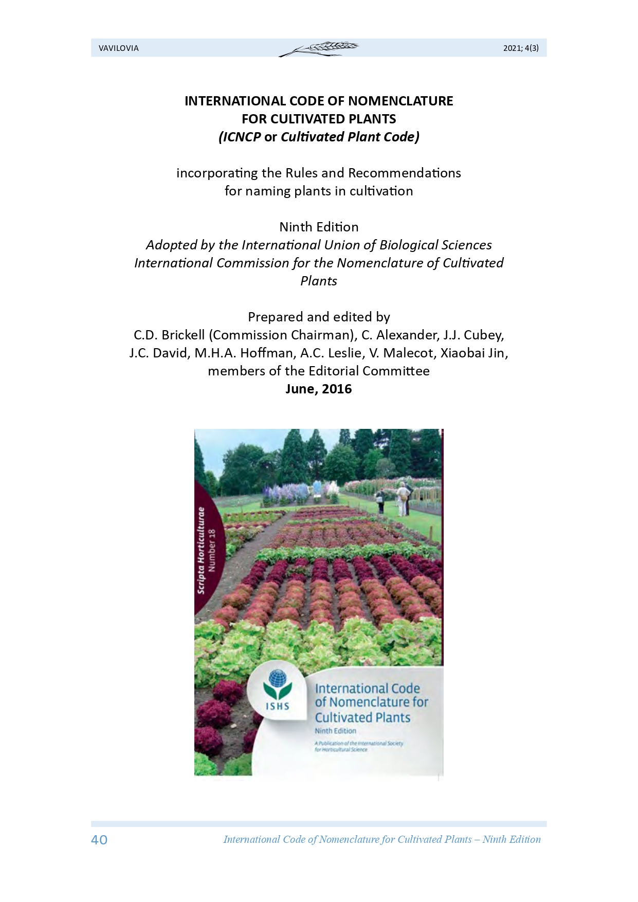 International Code of Nomenclature for Cultivated Plants. Division II: Chapters III-V. Vavilovia. 2021;4(3):40-57. (In Russ.) https://doi.org/10.30901/2658-3860-2021-3-40-57